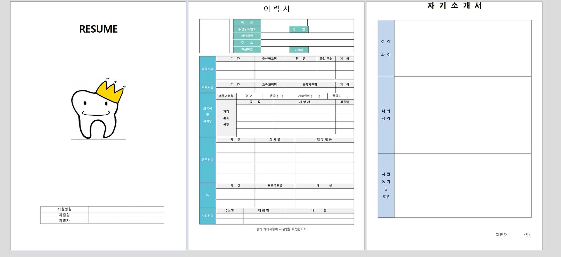표지, 이력서 및 자기소개서 양식입니다.